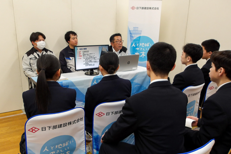 当日は都市環境工学科、建築科の1,2年生徒133名が参加、当社ブースにも28名の生徒が参加し、建設業の魅力、当社の得業について説明した後、同校の若手OB職員からは現在の現場での仕事内容等を紹介しました。